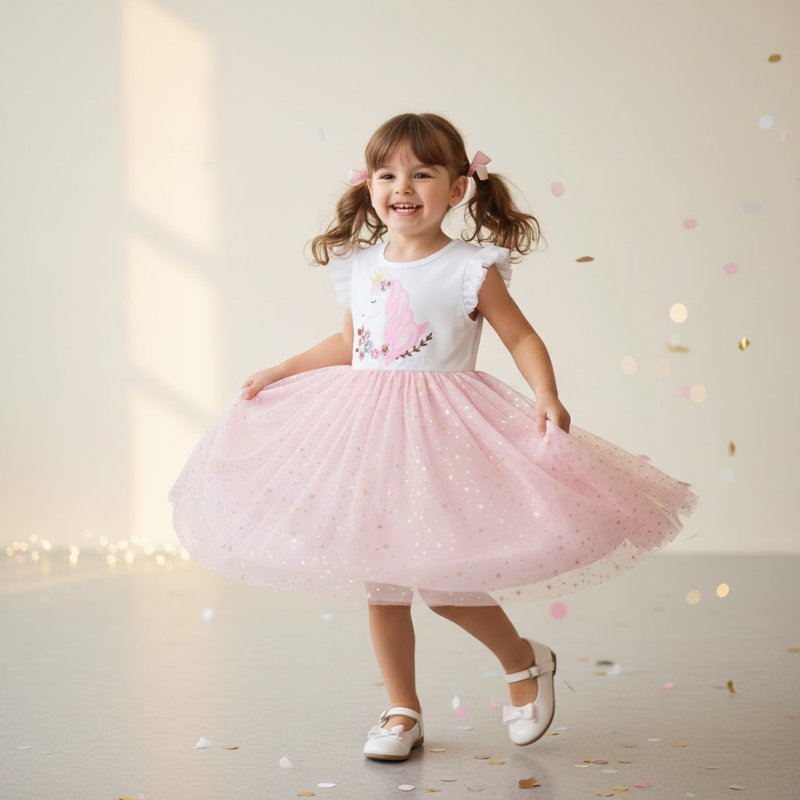 The Blush Unicorn Play Dress is made for play, movement, and happy moments. Featuring a soft crowned unicorn illustration on a breathable cotton bodice and a lightweight blush tulle skirt with subtle shimmer, this dress is easy to wear and easy to love.