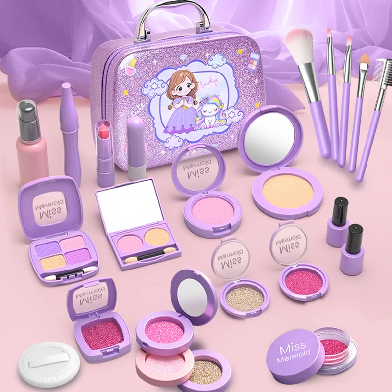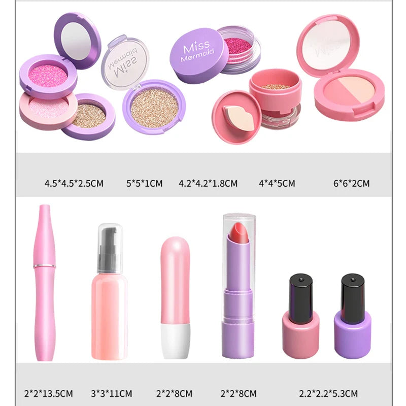 Inside, she’ll find a full collection of kid-friendly makeup toys, brushes, blush pots, pretend lipsticks, a compact mirror, and accessories, all tucked neatly into a sturdy unicorn-themed case. It’s lightweight, easy to carry, and perfect for travel, playdates, or simply creating magical moments at home.