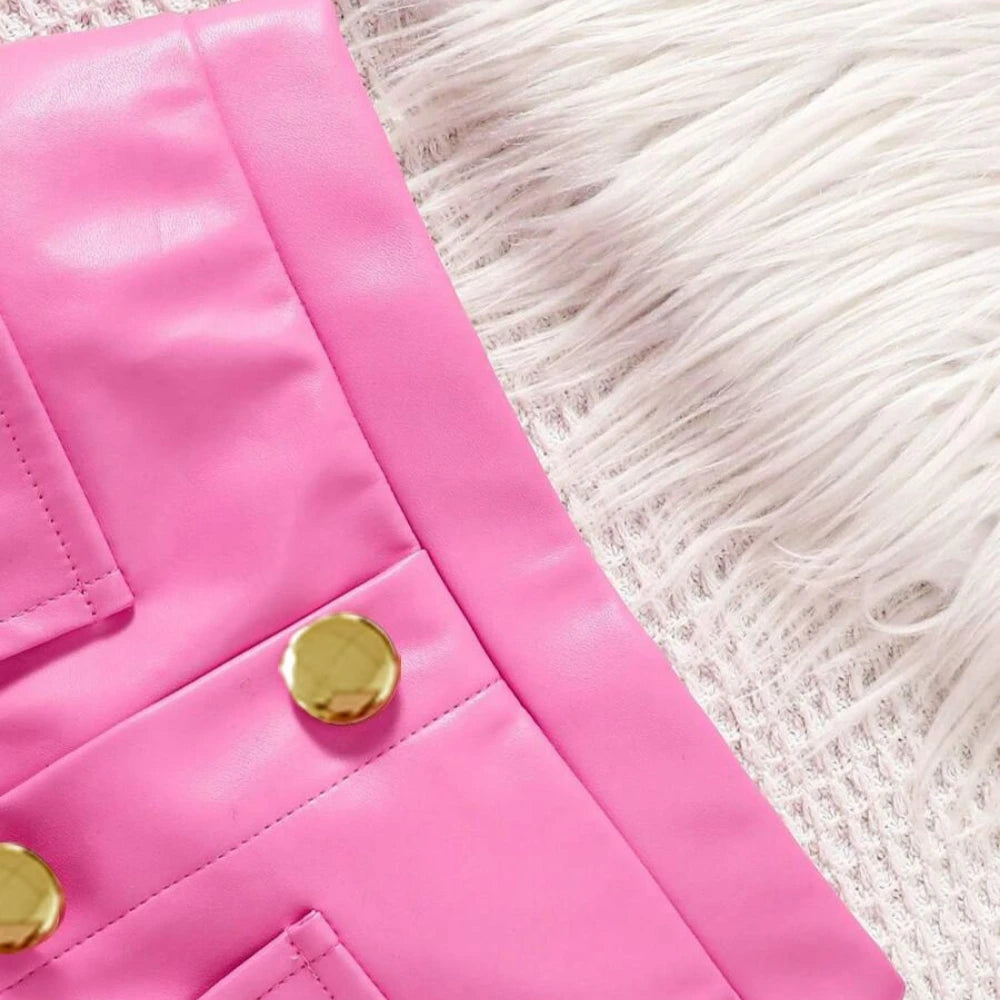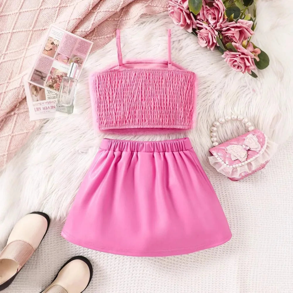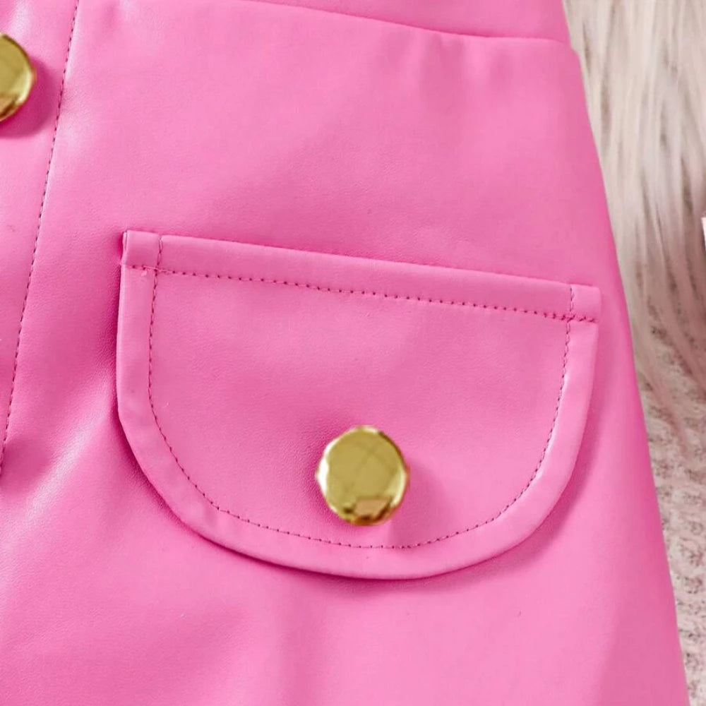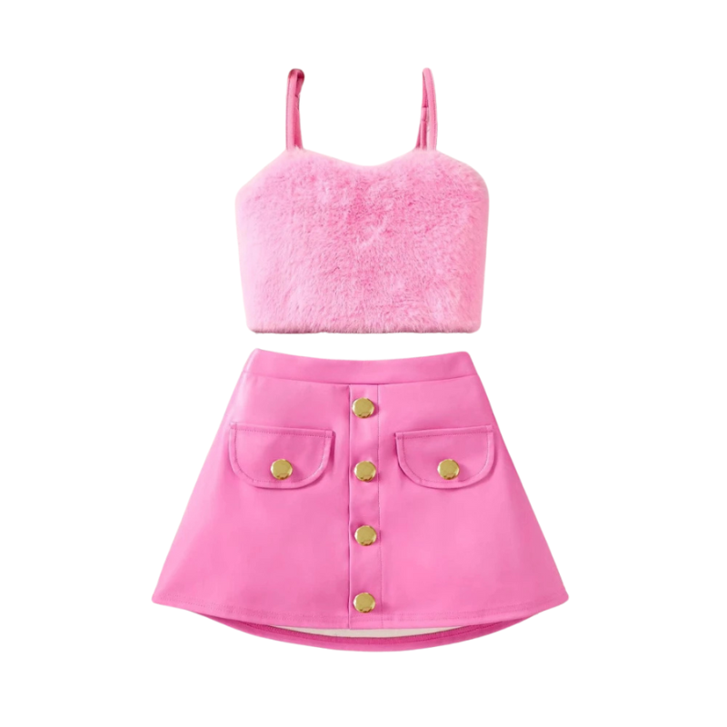 Let her strut in style with The Mini Diva Set—a head-turning 2-piece outfit featuring a plush fuzzy pink crop top and a glossy pleather-style A-line skirt with gold button details and front pockets. It’s the perfect mix of glam and playful charm, made just for your little trendsetter.